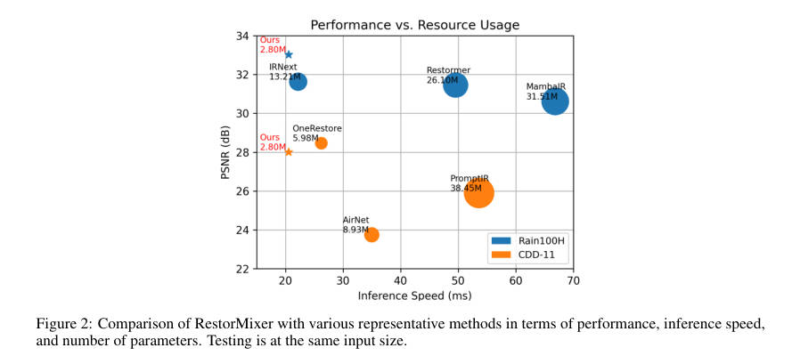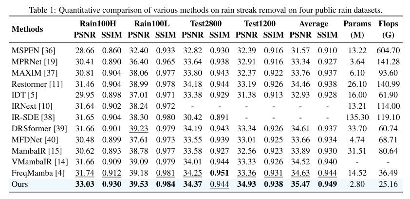 - 去雨 (Rain100H) :RestorMixer 达到了 33.03 dB 的 PSNR,比 MambaIR 高出不少,且参数量仅为 2.8M。
