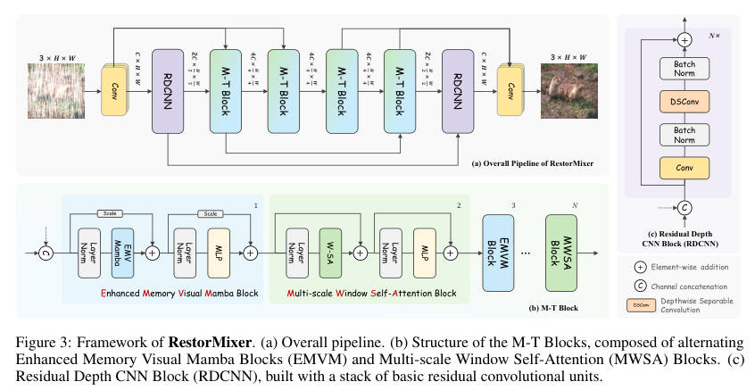 - 三阶异构混合架构 (RestorMixer):首创性地在编码器-解码器的不同阶段分别部署 CNN、Mamba 和 Transformer 模块,根据特征分辨率的特性进行最优匹配。