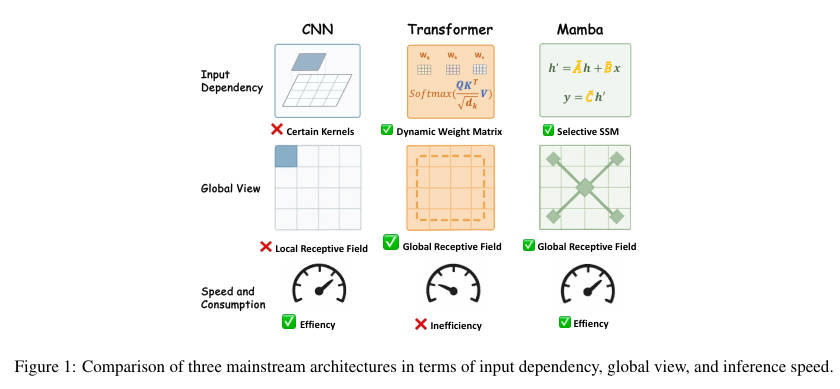 - 左侧 (CNN) :我们可以看到 CNN(蓝色)虽然在 推理速度 (Speed) 上表现优异(Effiency),但由于卷积核的物理限制,它缺乏 全局感受野 (Global View) 和 输入依赖性 (Input Dependency),即它是静态的,无法根据输入内容动态调整权重。