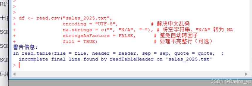 这说明 R 无法在当前工作目录中找到 sales_2025.txt 文件。