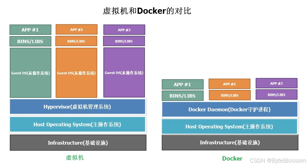 虚拟机与容器docker的区别,在于vm多了一层guest OS,虚拟机的Hypervisor会对硬件资源也进行虚拟化,而容器Docker会直接使用宿主机的硬件资源。