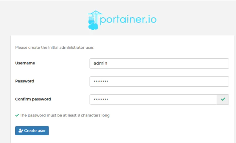 当控制台没有输出错误,并显示正常启动后,我们分开服务器的9000端口,浏览器输入服务器ip:9000,即可进入Portainer初始化界面,它会要求我们配置用户名密码: