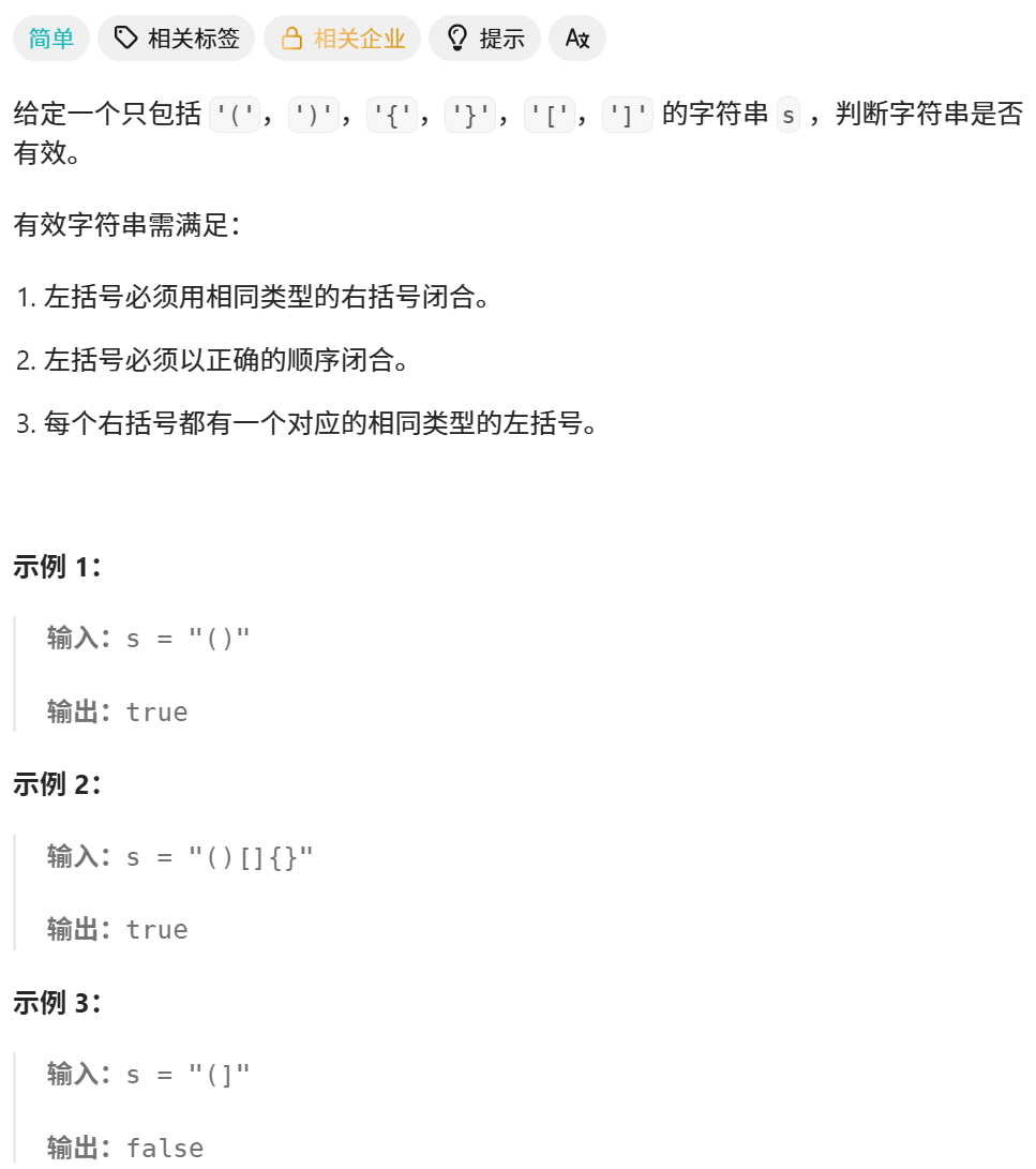 - 使用栈,每次拿到左括号入栈,拿到右括号弹出栈顶是否是左括号,如果不是(或者栈已经为空)则返回 false。