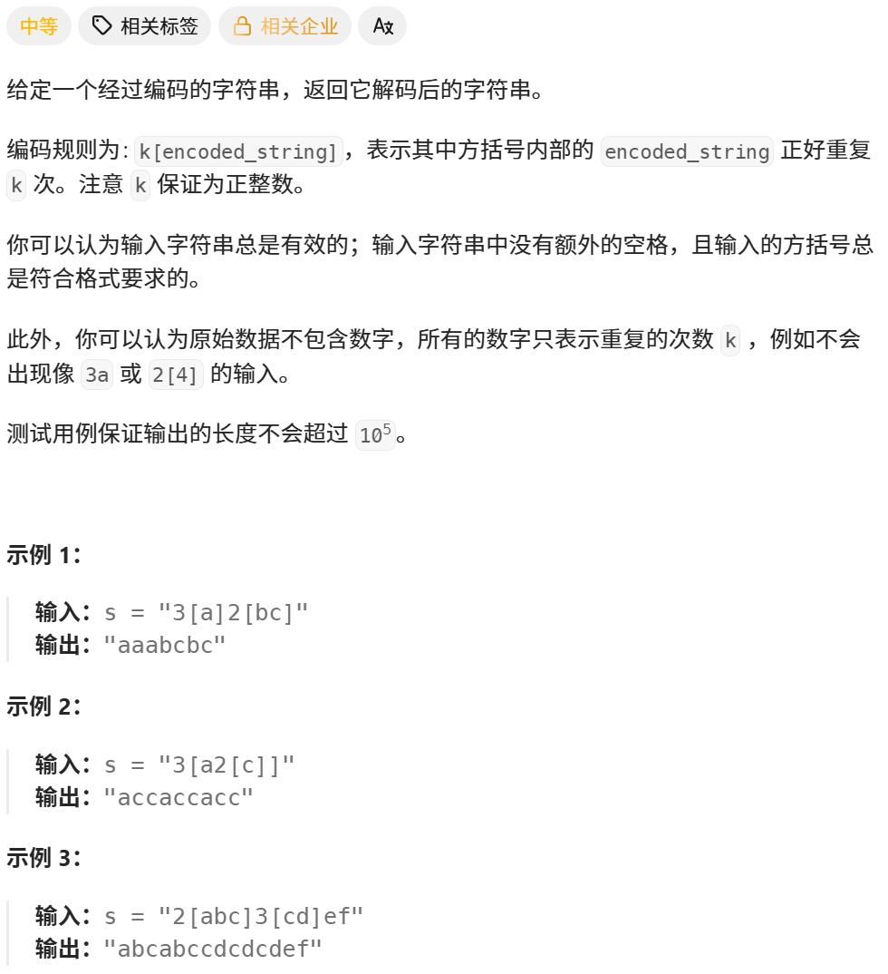 - 时间复杂度:设解码后字符串长度为S,则O(S),空间复杂度也是O(S)。