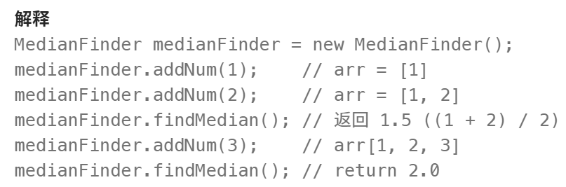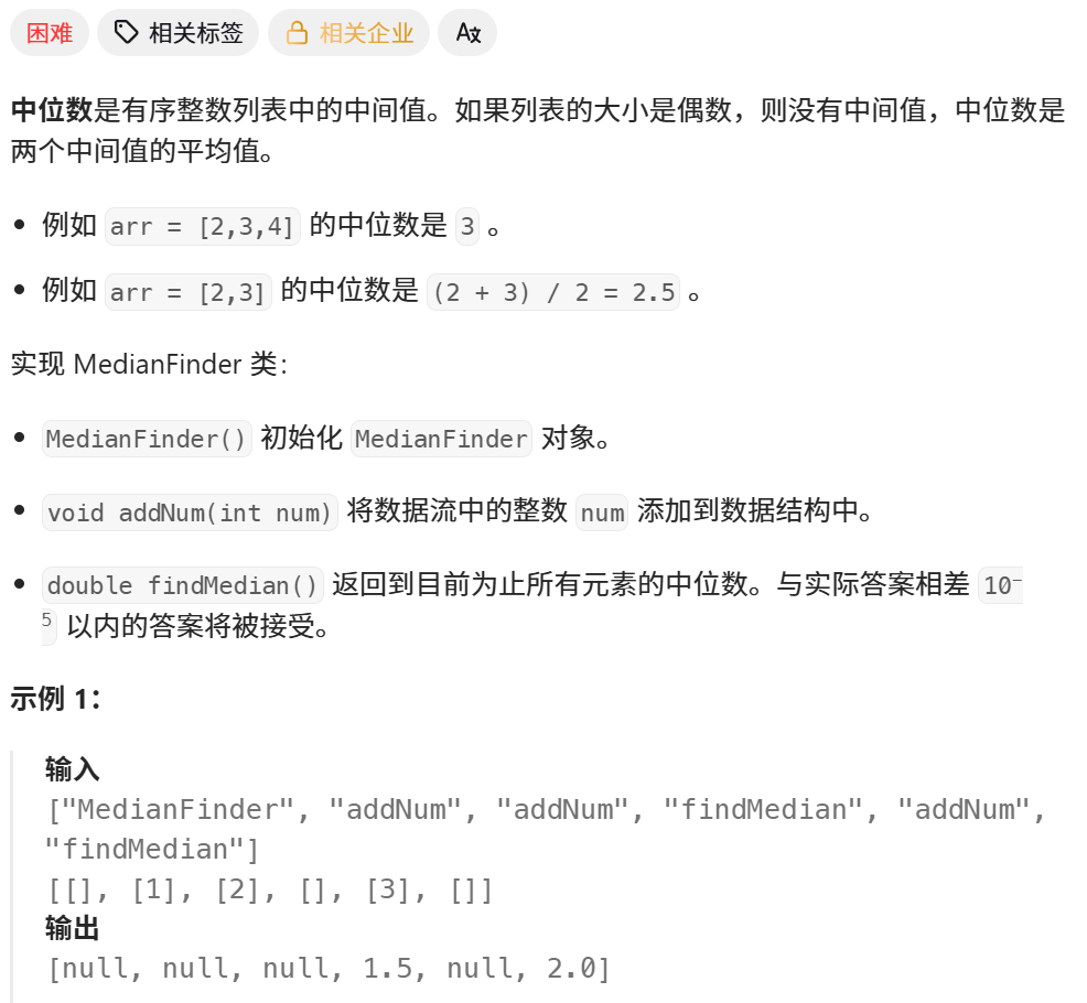 - 若长度相等,插入小根堆,再把小根堆的最小值转移到大根堆(维持左比有多一个节点,维持左比右小)。