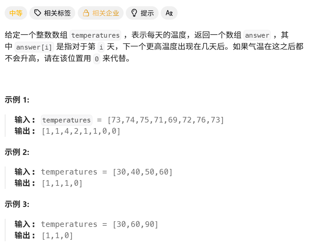 - 遍历元素 <= 栈头,不是更大温度,直接入栈。