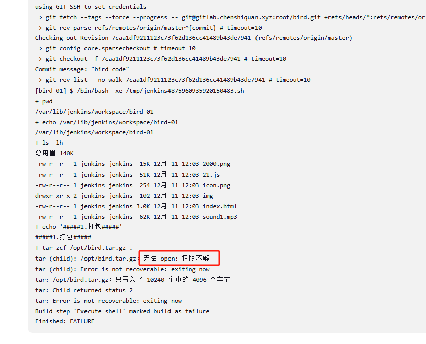 - 构建过程中发现权限不够,需要将运行的jenkins用户改为root
