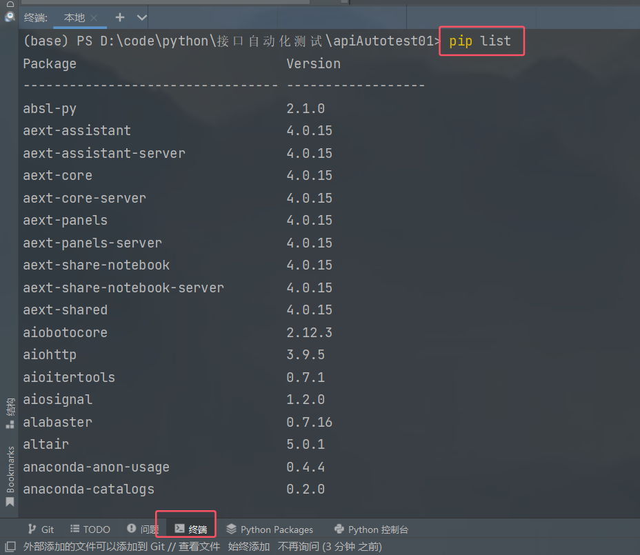 requests下面出现红色波浪线,提示没有安装requests模块,这个时候可以点击终端来查询到底有没有这个。没安装也没啥,下一步安装。
