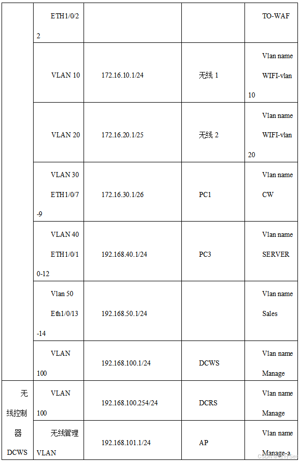 | 3 | 根据网络拓扑图所示,按照 IP 地址参数表,对 AC 的名称、各接口 IP 地址进行配置。 |
