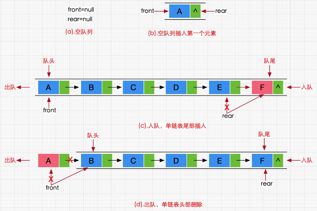 - 队列的操作受限于两端:只能在队尾插入 (入队),在队头删除(出队)。