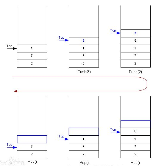 top指向栈顶指针,指向栈顶元素的下一个位置,也代表元素个数