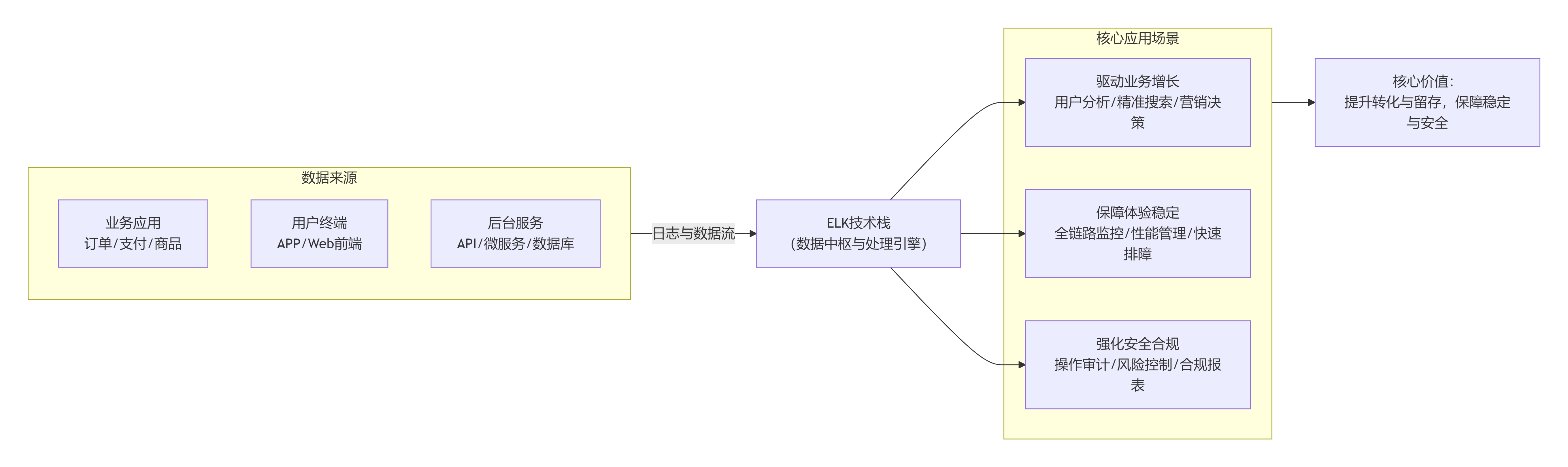 与光伏或农业场景主要聚焦于设备监控和环境数据分析不同,电商零售领域的ELK应用维度更广,其核心价值是为业务增长 与系统稳定两大目标提供数据驱动支持。具体应用蓝图可概括如下: