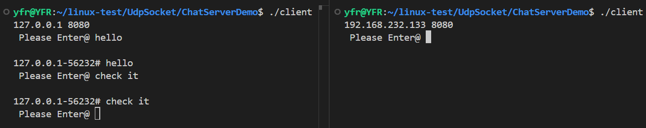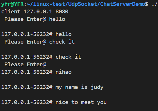 <<", Port:"<<clientaddr.Port()<<", message:"<<buffer;