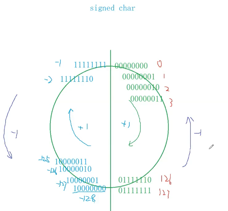 逆时针方向循环转动就是-1,-2,-3,-127,-128,127,126......2,1,0,-1,-2......