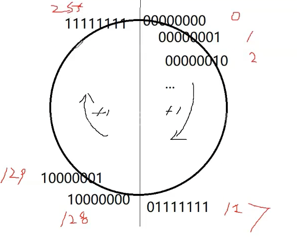 如果顺时针方向循环转动就是0,1,2,3,......126,127,-128,-127......-2,-1,0,1,2......