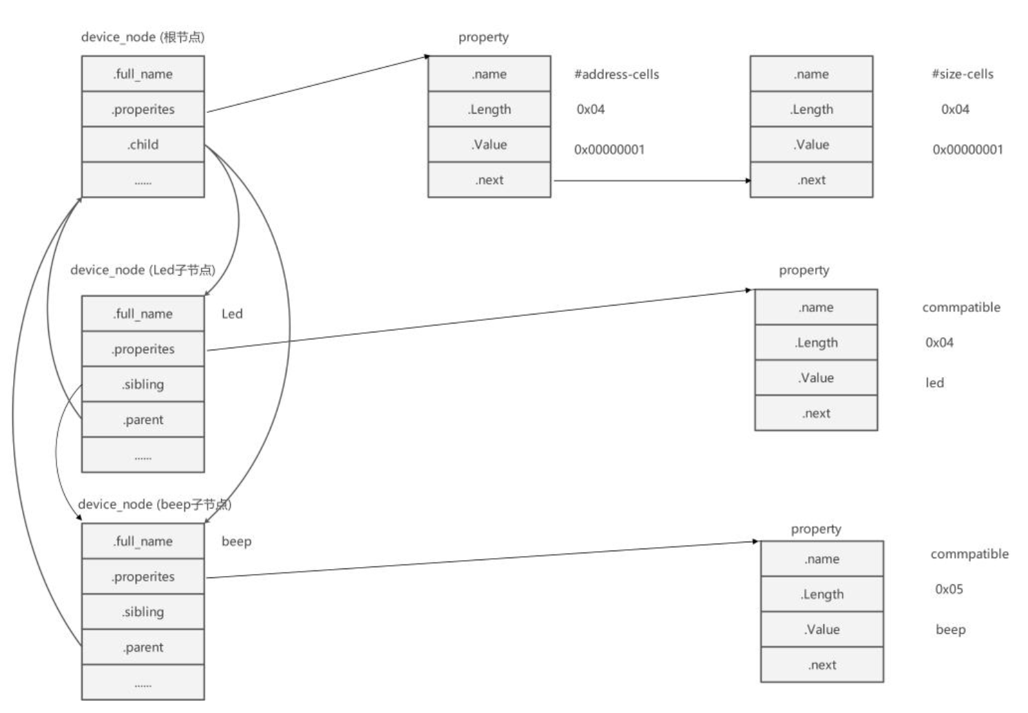 cppstruct device_node { const char *name; //设备节点的名称 const char *type; //设备节点的类型 phandle phandle; //设备节点的句柄 const char *full_name; //设备节点的完整名称 struct fwnode_handle fwnode; //设备节点的固件节点句柄 struct property *properties; //设备节点的属性列表 struct property *deadprops; //已删除的属性列表 struct device_node *parent; //设备节点的父节点 struct device_node *child; //设备节点的子节点 struct device_node *sibling; //设备节点的同级节点 #if defined(CONFIG_OF_KOBJ) struct kobject kobj; //内核对象(用于 sysfs) #endif unsigned long _flags; //设备节点的标志位 void *data; //与设备节点相关的数据指针 #if defined(CONFIG_SPARC) const char *path_component_name; //设备节点的路径组件名称 unsigned int unique_id; //设备节点的唯一标识 struct of_irq_controller *irq_trans; //设备节点的中断控制器 #endif };可以通过 device_node 结构体中节点的名字、 父节点、 子节点和同级节点, 以代码方式构建出与 dts 文件中一致的设备节点关系。其中 properties 字段是指向设备节点属性的指针。 设备节点的属性包含了与设备节点相关联的配置和参数信息