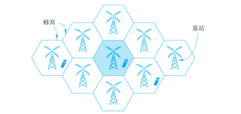 正因为频谱稀缺,从而导致了蜂窝网络 的出现,如图1-21所示,现在的移动电话网络就采用了这种设计。为了管理用户之间的无线电干扰,系统的覆盖区域被分成一个个蜂窝。在一个蜂窝内,为用户分配互相不干扰的信道,而且分配的信道对相邻蜂窝也不能干扰太大。这使得相邻蜂窝中的频谱得以很好地重复使用,即频率重用(frequency reuse),从而增加了整个网络的容量。在1G系统中,每个语音通话在特定的频率上进行,使用的频率都要经过仔细选择,从而使得它们不与邻近蜂窝发生冲突。在这种方式下,一个给定的频率只能一次被几个蜂窝重用。现代的3G系统允许每个蜂窝使用全部的频率,但以一种允许相邻蜂窝之间存在可接受的干扰的方式分配频率。蜂窝的设计有许多变体,其中包括在蜂窝发射塔上使用定向天线或扇形天线进一步减少相邻蜂窝之间的频率干扰,但基本思路是相同的。