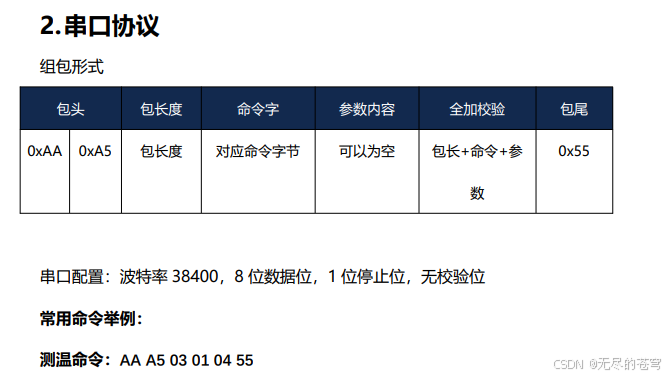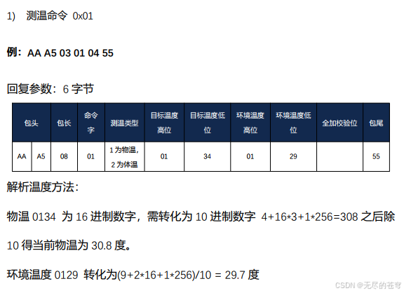 uint8_t cmd[] = {0xAA, 0xA5, 0x03, 0x01, 0x04, 0x55}; //查询温度