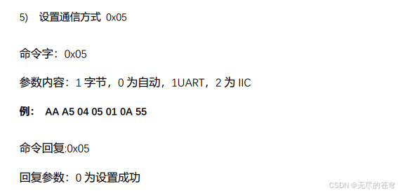 认为串口协议,5 秒内未接收到串口命令则自动切换到 IIC 协议,在串口协议与