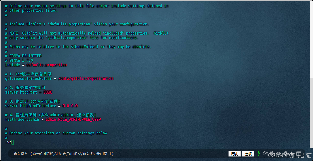 进入 GitBlit 目录,编辑配置文件(位置在文件最后,可以键盘按大写G到文件末尾,再编辑):