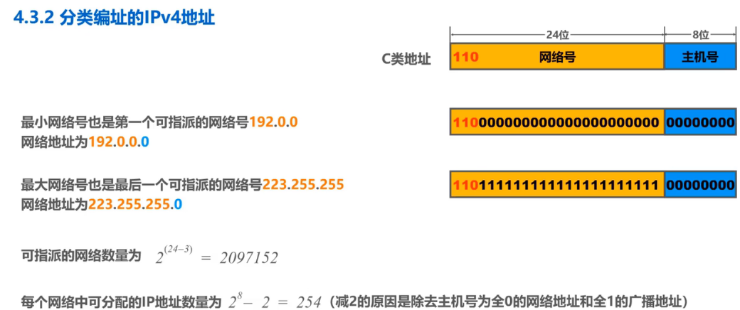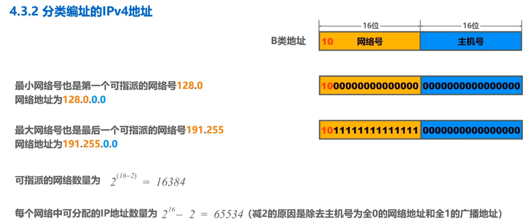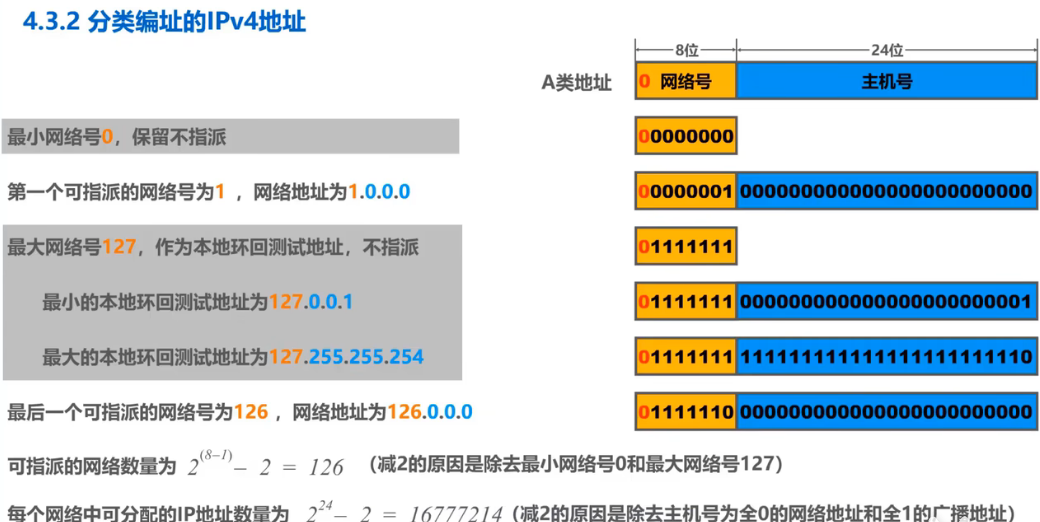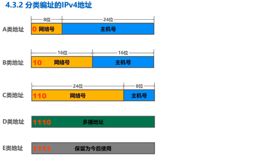 - 只有A类、B类和C类地址可分配给网络中的主机或路由器的各接口