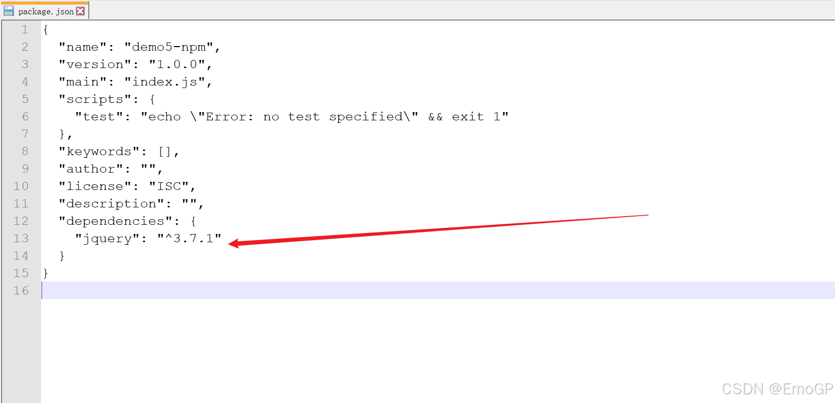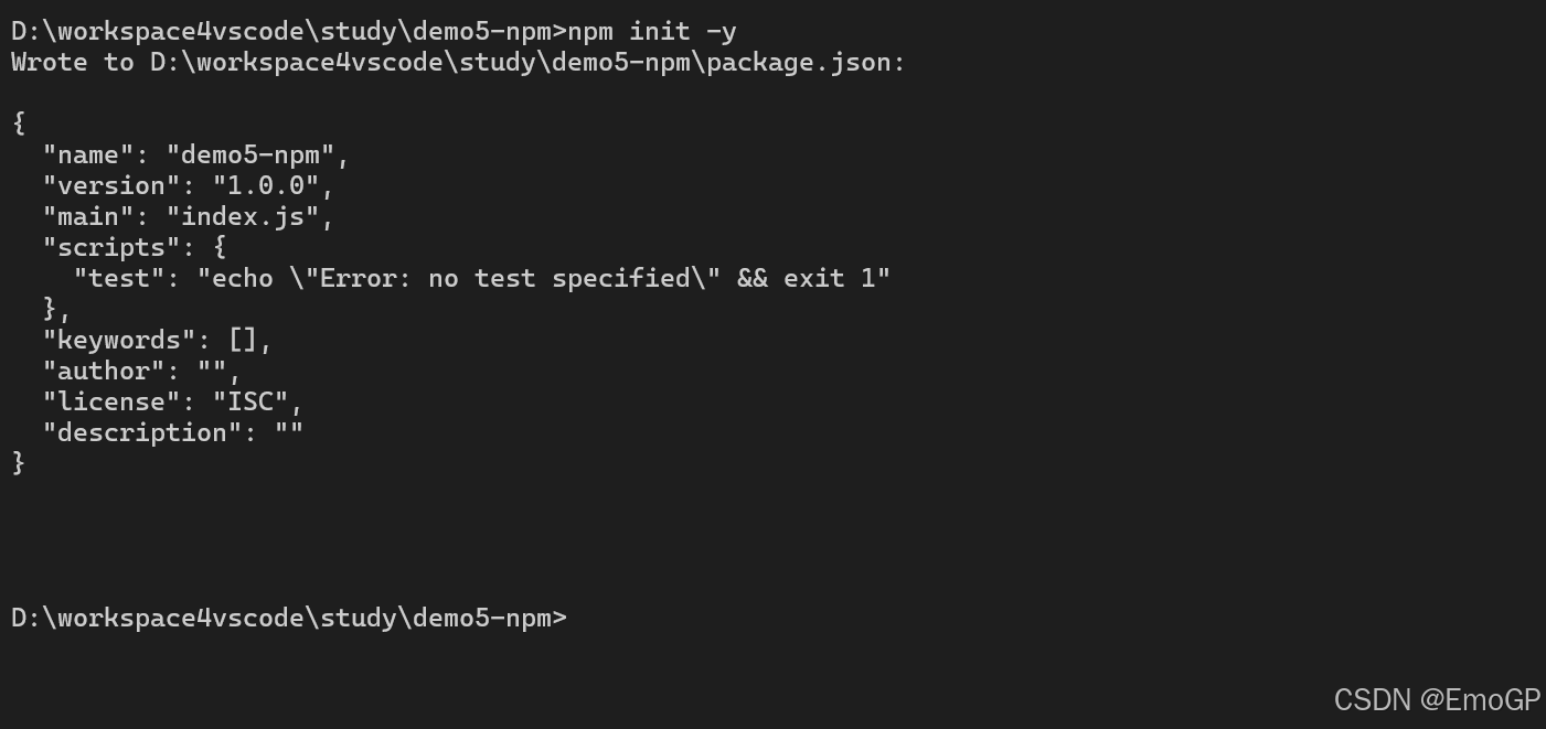 进入目录中,执行npm init命令后,npm会引导我们在命令行界面上回答一些问题,例如项目名称,版本号,作者,许可证等信息,并最终生成一个package.json,该文件包含项目基本信息,类似maven的pom.xml