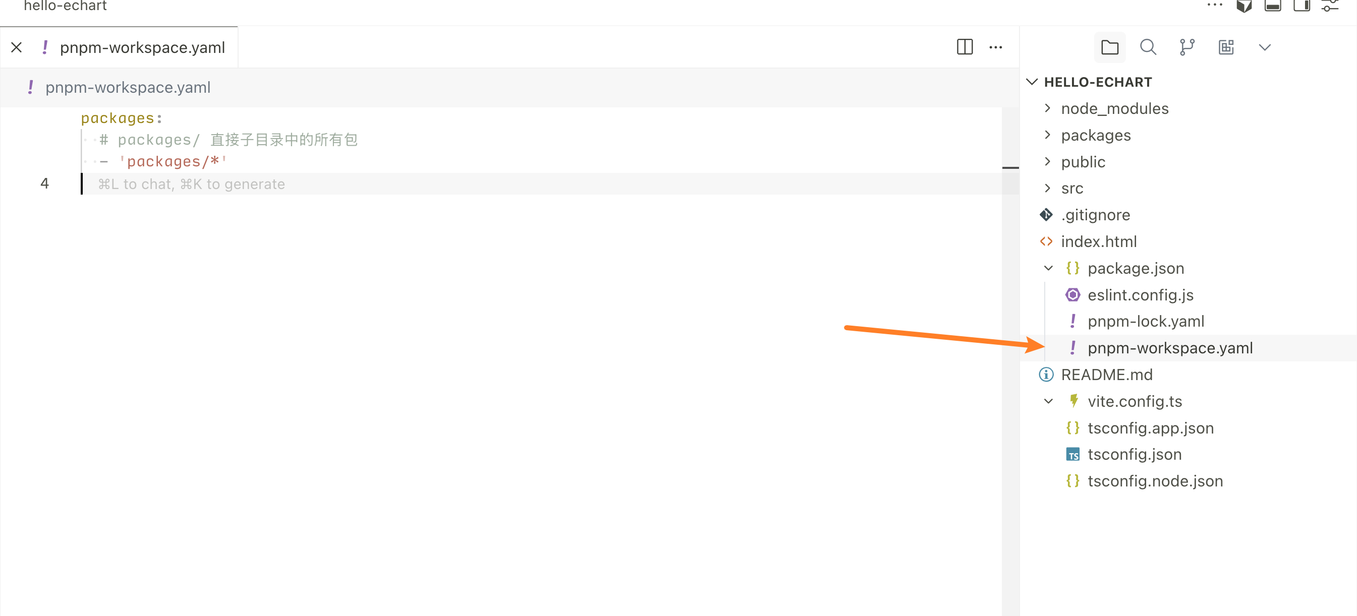 然后在项目根目录下,新建一个 pnpm-workspace.yaml 文件,用于搭建本地开发依赖库的说明。具体细节可以看 pnpm 的官网文档