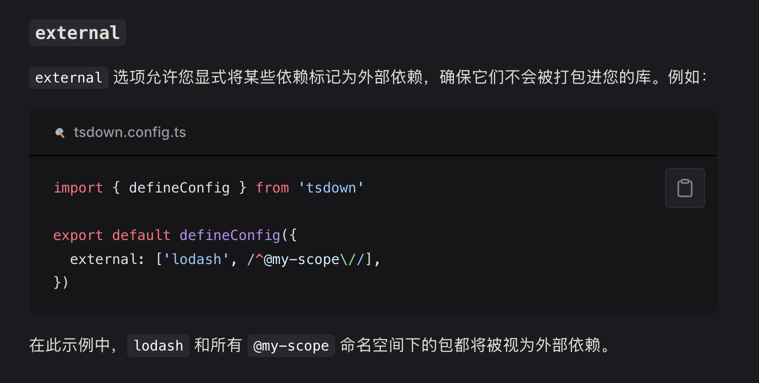 我选用的是 tsdown,这个是官方文档,也可以使用官网的开发模板快速搭建一个空项目 https://tsdown.dev/zh-CN/guide/getting-started