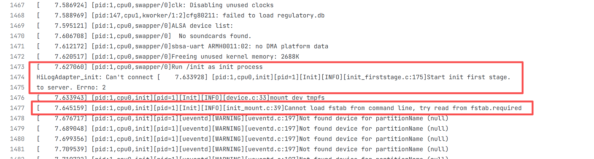 芯片初始化成功(没有painc),进入到oh init进程,硬盘设备初始化,导致读不到分区表,最后oh分区没有挂载。相关内核日志