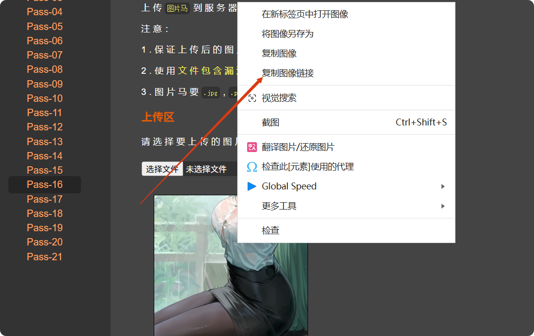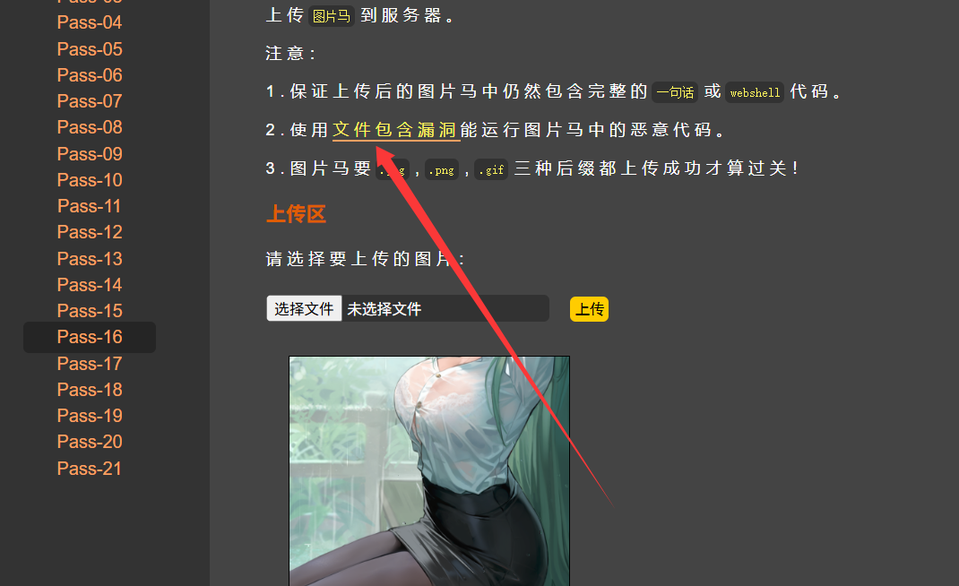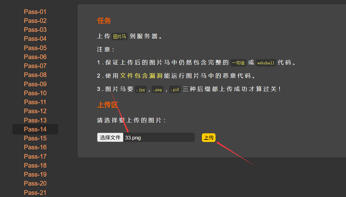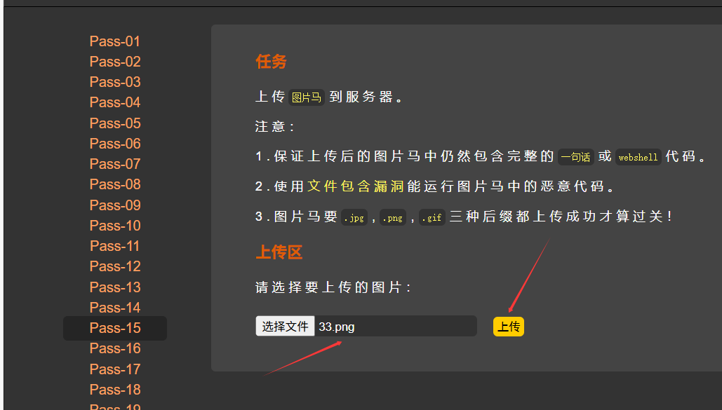 这一关和14关其实是一样的操作方法就可以通过,首先上传上一关的33.png这个图片马文件