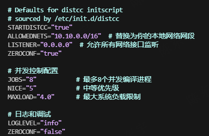 /etc/default/distcc文件:bashsudo vim /etc/default/distcc修改以下参数: