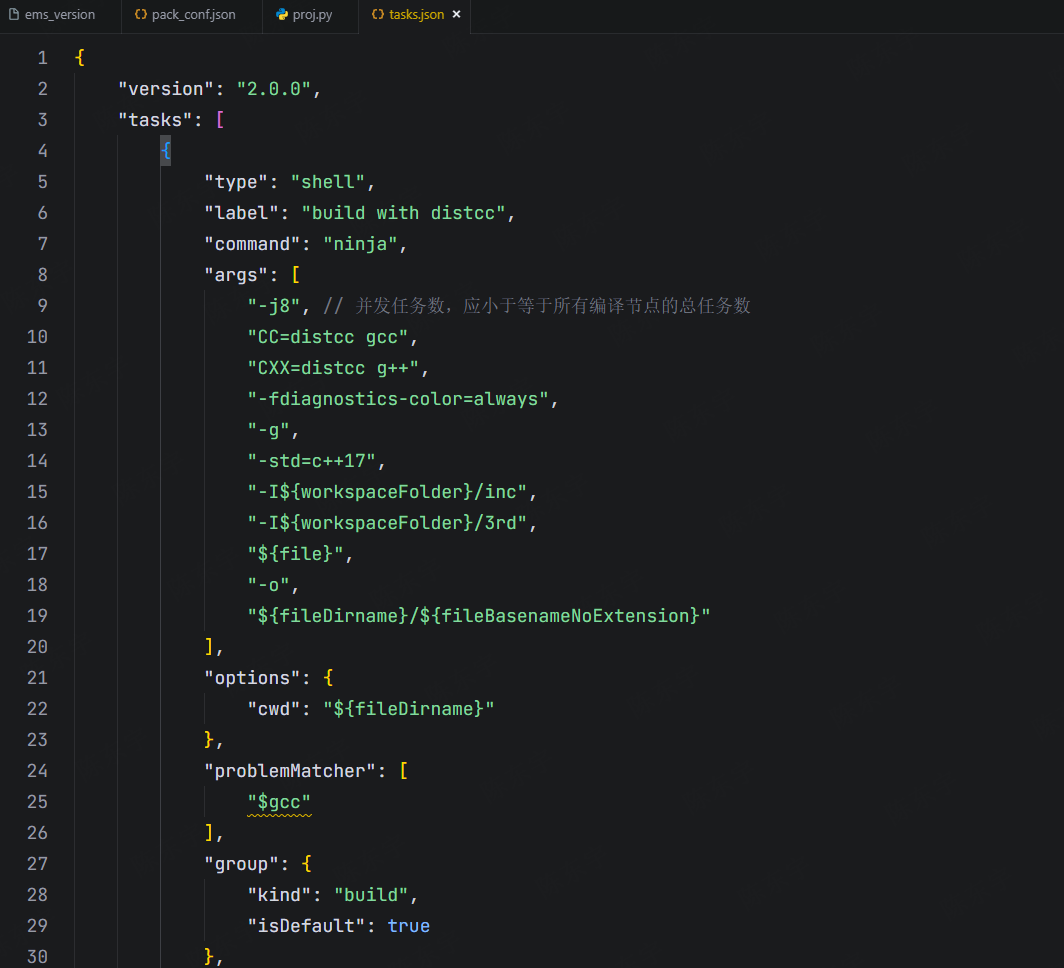 VSCode通过tasks.json配置文件来管理编译任务,我们可以通过修改该文件来集成distcc。