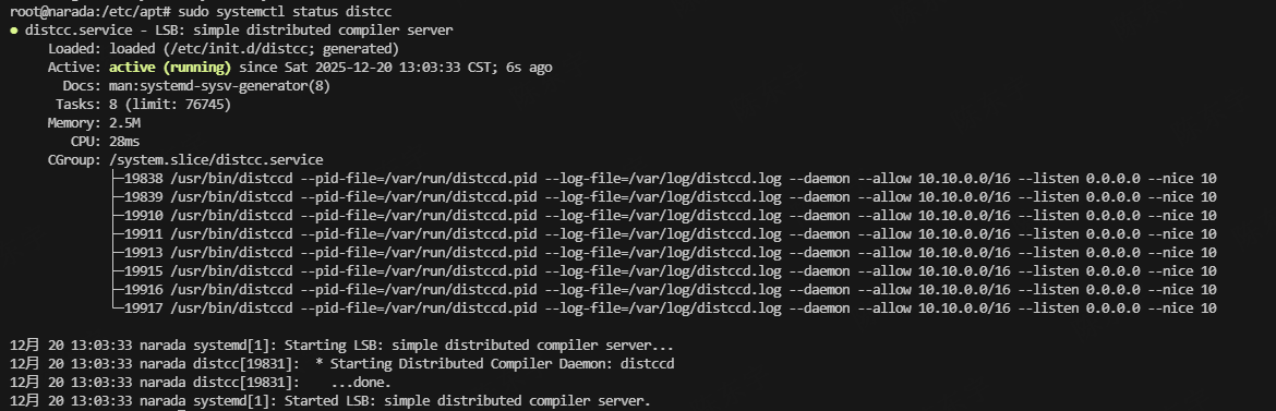 BASHsudo systemctl restart distcc sudo systemctl enable distcc # 设置开机自启 -