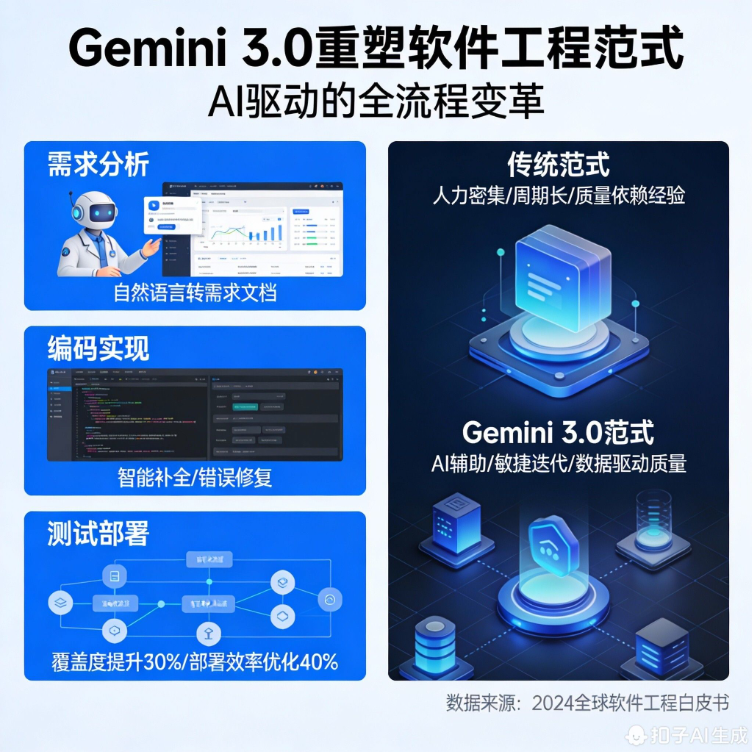 Google AI在2024年软件工程峰会上提出:"下一代开发范式是'人类定义意图,AI执行实现,人机协同进化'"。Gemini 3.0通过**"需求-设计-编码-测试-运维"全链路智能闭环**,实现"开发即推理,协作即协同"。