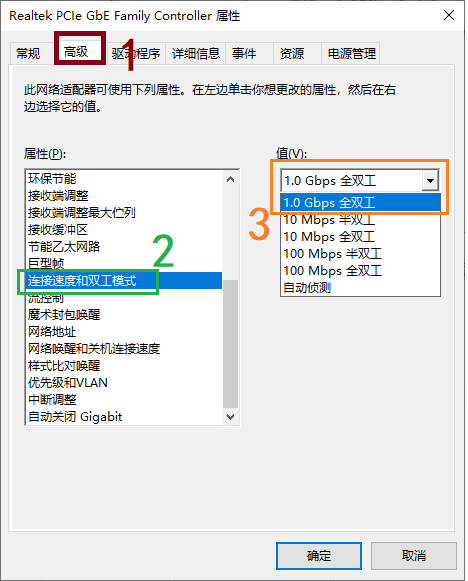 选择"1.0 Gbps 全双工",然后点击确定,关闭所有窗口