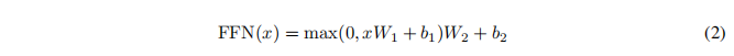 除注意力子层外,我们的编码器和解码器中每一层均包含一个全连接前馈网络,该网络以相同方式独立应用于每个位置。该网络由两个线性变换构成,中间采用ReLU激活函数