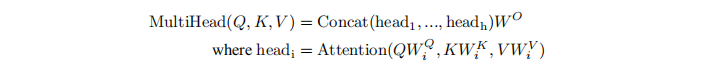 我们发现,与其使用d模型维度的键、值和查询执行单一注意力函数,不如将查询、键和值分别通过不同的学习线性投影线性映射到dk、dk和dv维度,共进行h次映射。随后对这些投影后的查询、键和值并行执行注意力函数,生成dv维输出值。将这些输出值拼接后再次进行投影,最终得到如图2所示的输出结果。