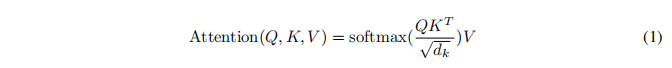 对所有键执行查询操作,将每个键值除以√dk,并应用softmax函数以获得各值的权重。实际操作中,我们将一组查询同时计算注意力函数,这些查询被打包成矩阵Q。键值也被打包成矩阵K和V。输出矩阵的计算公式为: