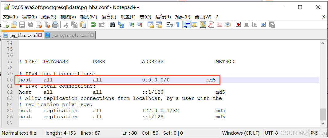 进入postgreSQL的data目录,打开pg_hba.conf,用记事本打开,找到IPv4 local connections,增加要连接postgreSQL的服务器ip,本例中设置所有网络都可访问。