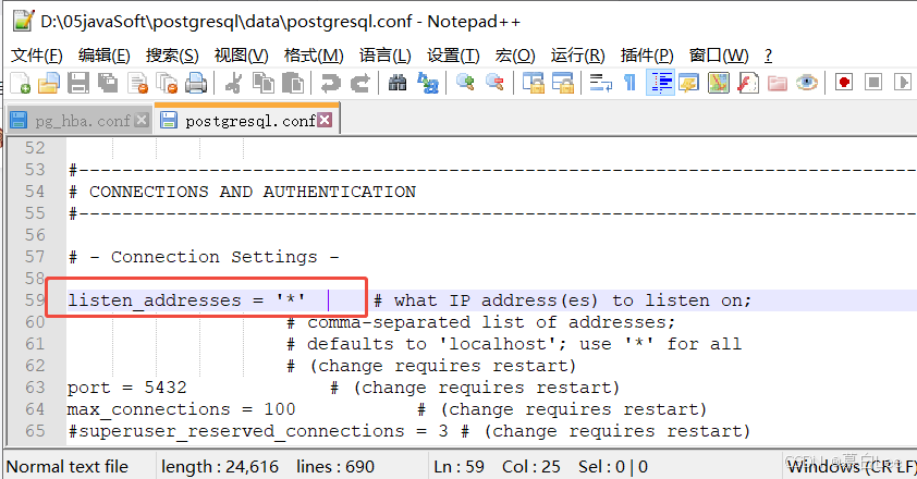 在data目录中找到postgresql.conf文件,用记事本打开,修改listen_addresses = '*',允许任何ip地址监听