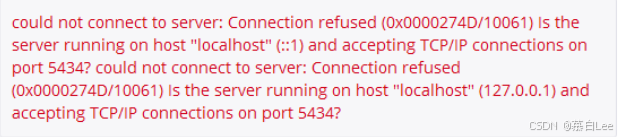1、could not connect to server:Connection refused (0x0000274D/10061) Is the server running on host"localhost"(::1)and accepting TCP/IP connection on port 5434