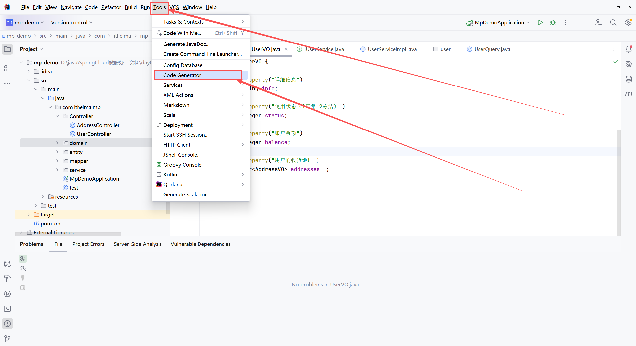 首先点击顶部菜单栏的tools,找到code generator,点击