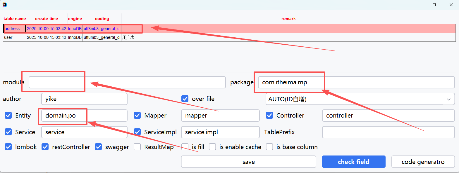 还有Entity这个里面的内容,要注意是domain.po不是默认的entity,如果这里没有改过来,回导致address这个类会创建在entity包下面,而不是和user一块的domain.po这个包的下面。