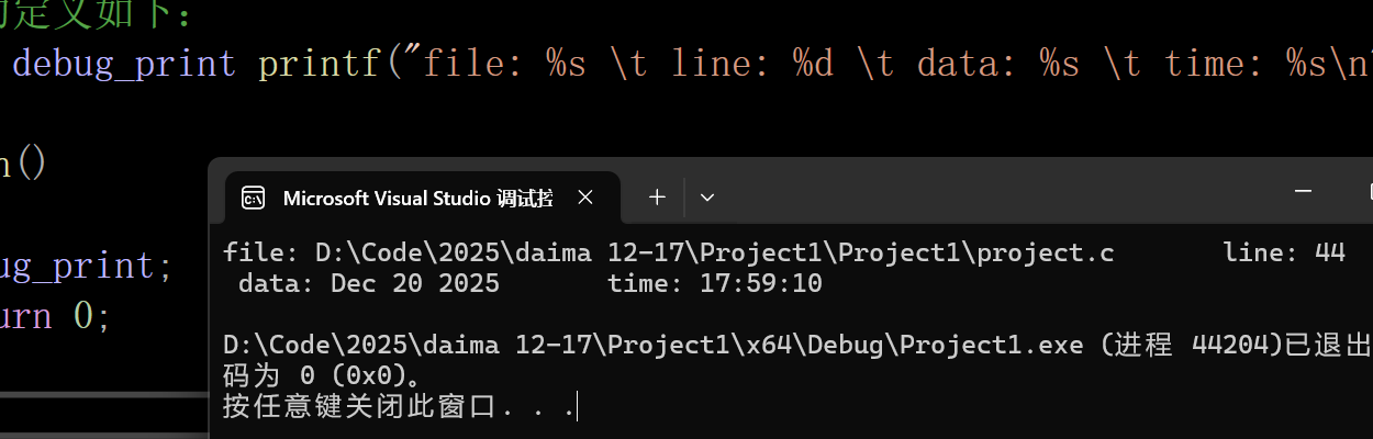 #define debug_print printf("file: %s \t line: %d \t data: %s \t time: %s\n",__FILE__,__LINE__,__DATE__,__TIME__)