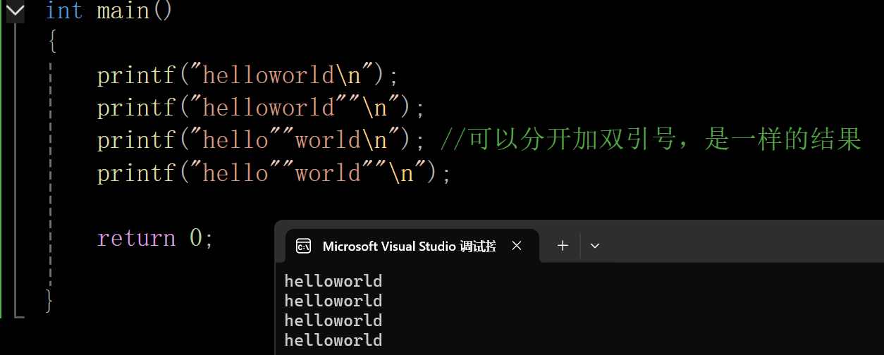 printf("hello""world\n"); //可以分开加双引号,是一样的结果