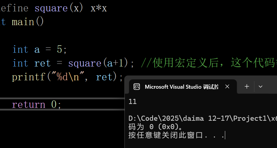 int ret = square(a+1); //使用宏定义后,这个代码等价于 int ret = a+1*a+1 = 11,不是36