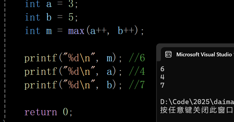 当宏参数在宏的定义中出现超过⼀次的时候,如果参数带有副作⽤,那么你在使⽤这个宏的时候就可能出现危险,导致不可预测的后果。副作⽤就是表达式求值的时候出现的永久性效果。