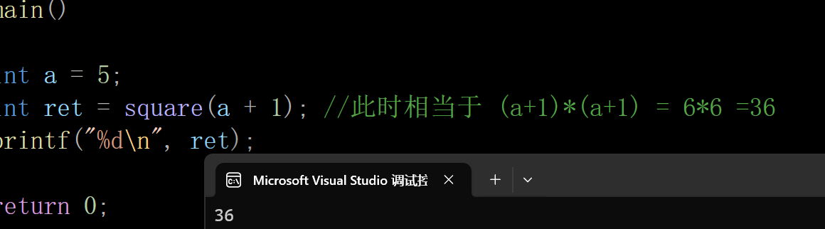 int ret = square(a + 1); //此时相当于 (a+1)*(a+1) = 6*6 =36