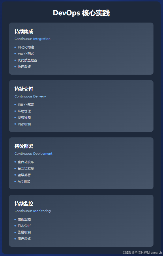 持续部署 :是CD的更高级阶段。在通过所有测试后,代码自动地部署到生产环境,无需人工干预。实现了从提交到上线的完全自动化。