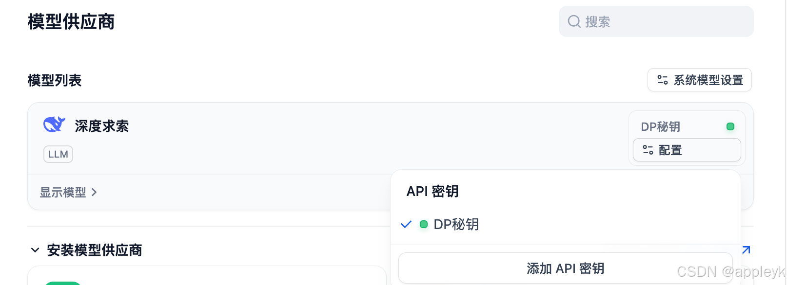 再回到模型供应商这里,设置下深度求索的apikey(DeepSeek开放平台),如下: